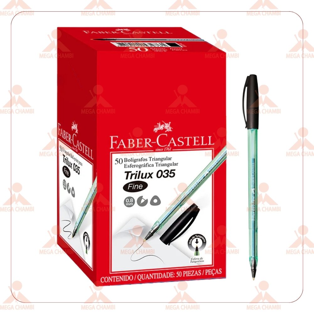 Bolígrafo FABER CASTELL Trilux 035-F negro, conocido por su suavidad y durabilidad. Caja de 50 unidades ideal para oficinas y colegios.