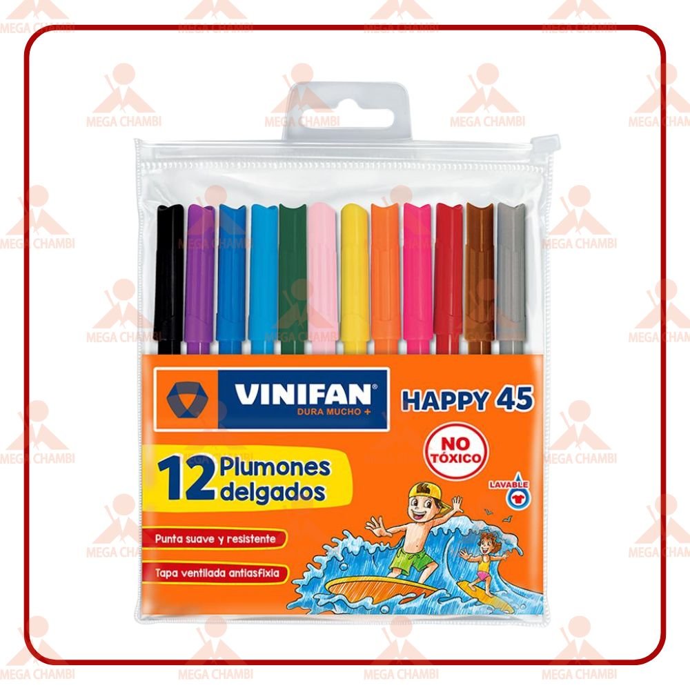Plumones VINIFAN Happy 45 de punta delgada, estuche de 12 colores brillantes. Perfectos para colorear y actividades escolares.